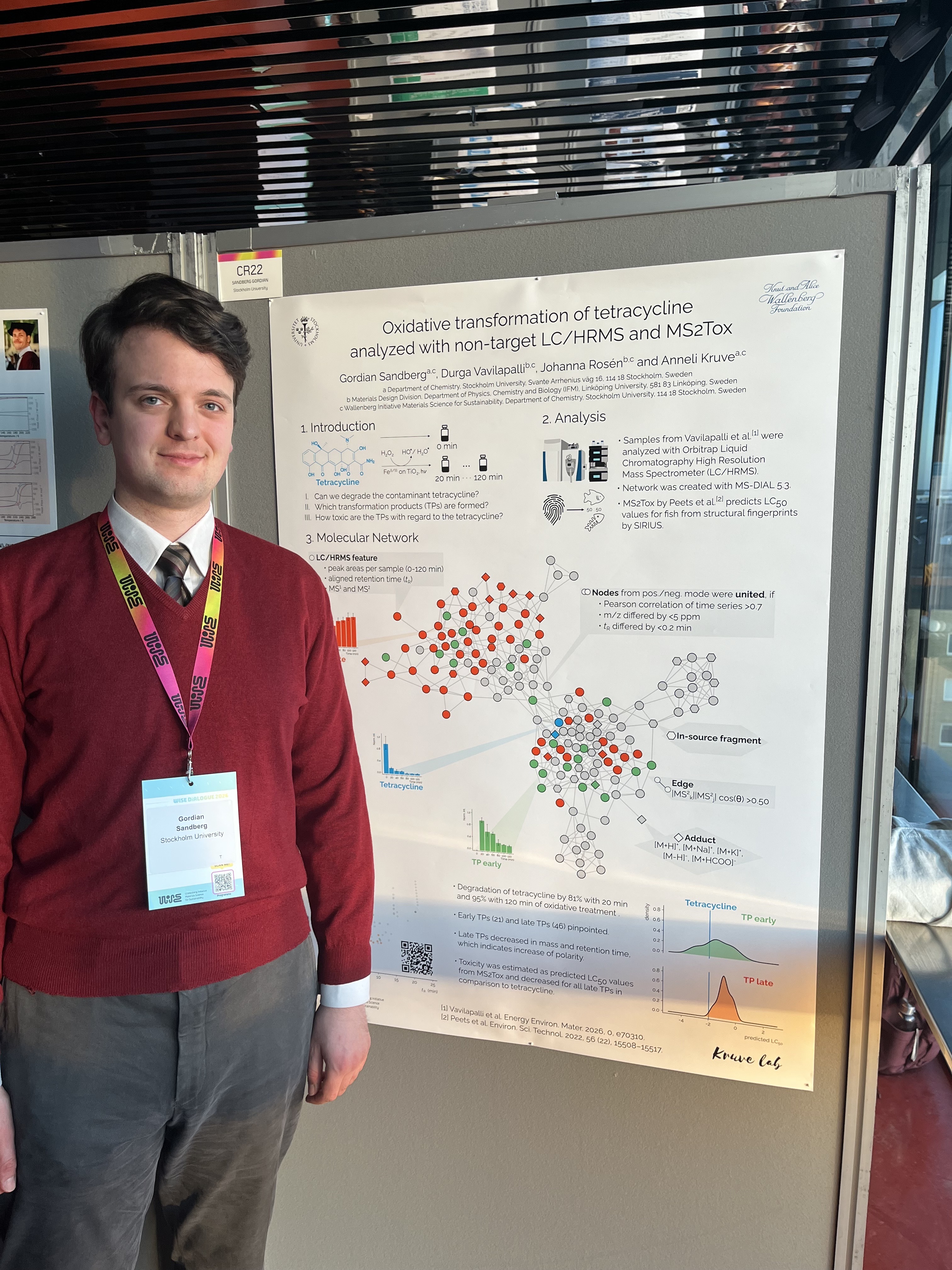 From 17th to 18th of March, the WISE Dialogue Meeting in Uppsala took place high above the roofs of the old university town in the Uppsala Konsert & Kongress venue. Representatives from Myfab, the ESS and Max IV were advertising cleanroom environments and synchroton access to the material scientists in the audience. After that, there was time for poster sessions. I presented my recently published research on Oxidative transformation of tetracycline analyzed with non-target LC/HRMS and MS2Tox (https://doi.org/10.1002/eem2.70310), a collaboration project with Durga Vavilapalli and Johanna Rosén at Linköping University.